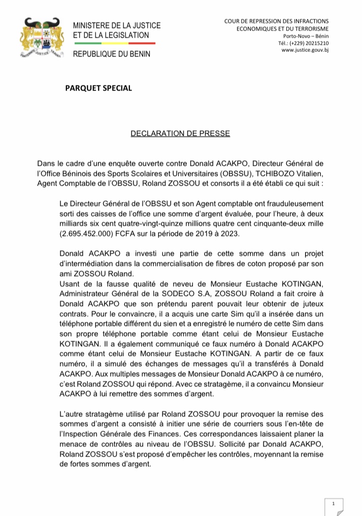 Selon le Procureur, « le Directeur Général de l’OBSSU et son Agent comptable ont frauduleusement sorti des caisses de l’office une somme d’argent évaluée, pour l’heure, à deux milliards six cent quatre-vingt-quinze millions quatre cent cinquante-deux mille (2.695.452.000) FCFA sur la période de 2019 à 2023. »