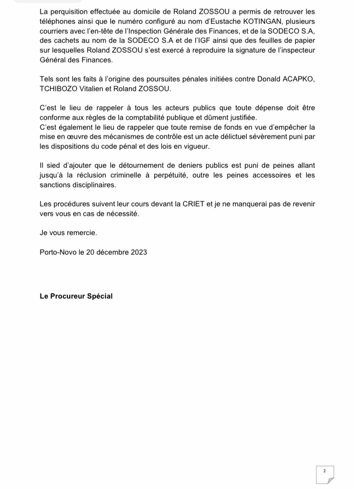 Le Procureur Spécial s’est prononcé sur les résultats de l’enquête en cours dans cette affaire de malversation dénommée « Affaire OBSSU ».
