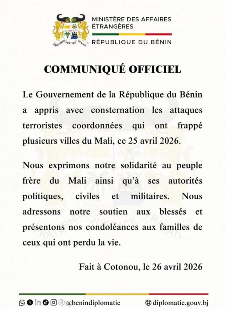À la suite des attaques terroristes coordonnées survenues dans plusieurs localités du Mali le 25 avril 2026, le gouvernement béninois a réagi avec émotion.