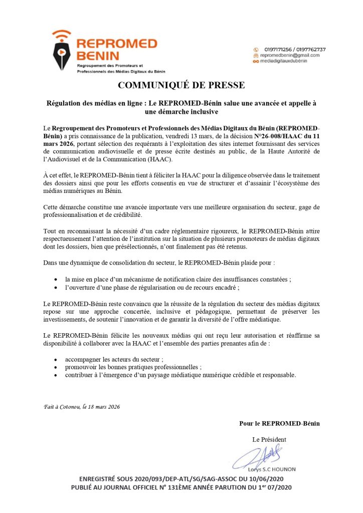 Dans un communiqué rendu public, le Regroupement des Promoteurs et Professionnels des Médias Digitaux du Bénin (REPROMED-Bénin) ayant pris connaissance de la publication des médias autorisés pour l’exploitation des sites internet fournissant des services de communication audiovisuelle et de presse écrite destinés au public, s’est exprimé pour donner son appréciation.