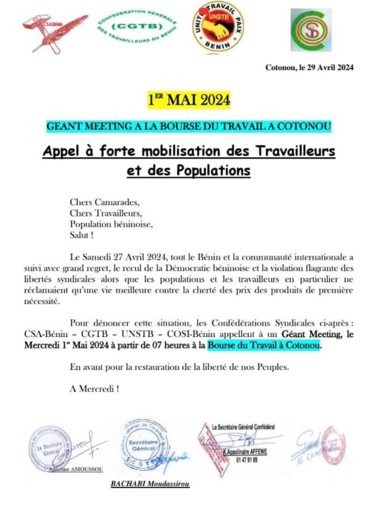 Les centrales et confédérations syndicales, notamment la CSA-Bénin, la CGTB, l’UNSTB et la COSI-Bénin appellent les travailleurs et la population à un géant meeting le mercredi 1er mai 2024 à la Bourse du travail à Cotonou.