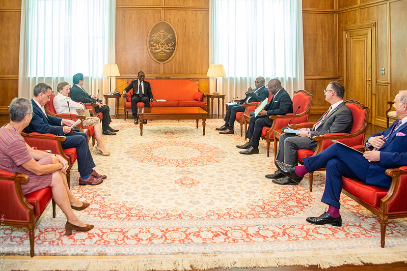 Conduite par Monsieur Marc VIZY, Ambassadeur de la France près le Bénin, la délégation est composée de Monsieur Xavier LEBLANC, Ambassadeur du Royaume de Belgique près le Bénin, Madame To TJOELKER-KLEVE, Ambassadrice du Royaume des Pays-Bas près le Bénin, Monsieur Michael DERUS, Ambassadeur agréé de la République Fédérale d’Allemagne près le Bénin, Madame Sylvia HARTLEIF, Cheffe de la Délégation européenne au Bénin, Monsieur Brian SHUKAN, Ambassadeur des États-Unis près le Bénin. Elle a été reçue en présence des ministres Aurélien AGBENONCI des Affaires étrangères et de la Coopération et Sévérin Maxime QUENUM de la Justice et de la Législation.