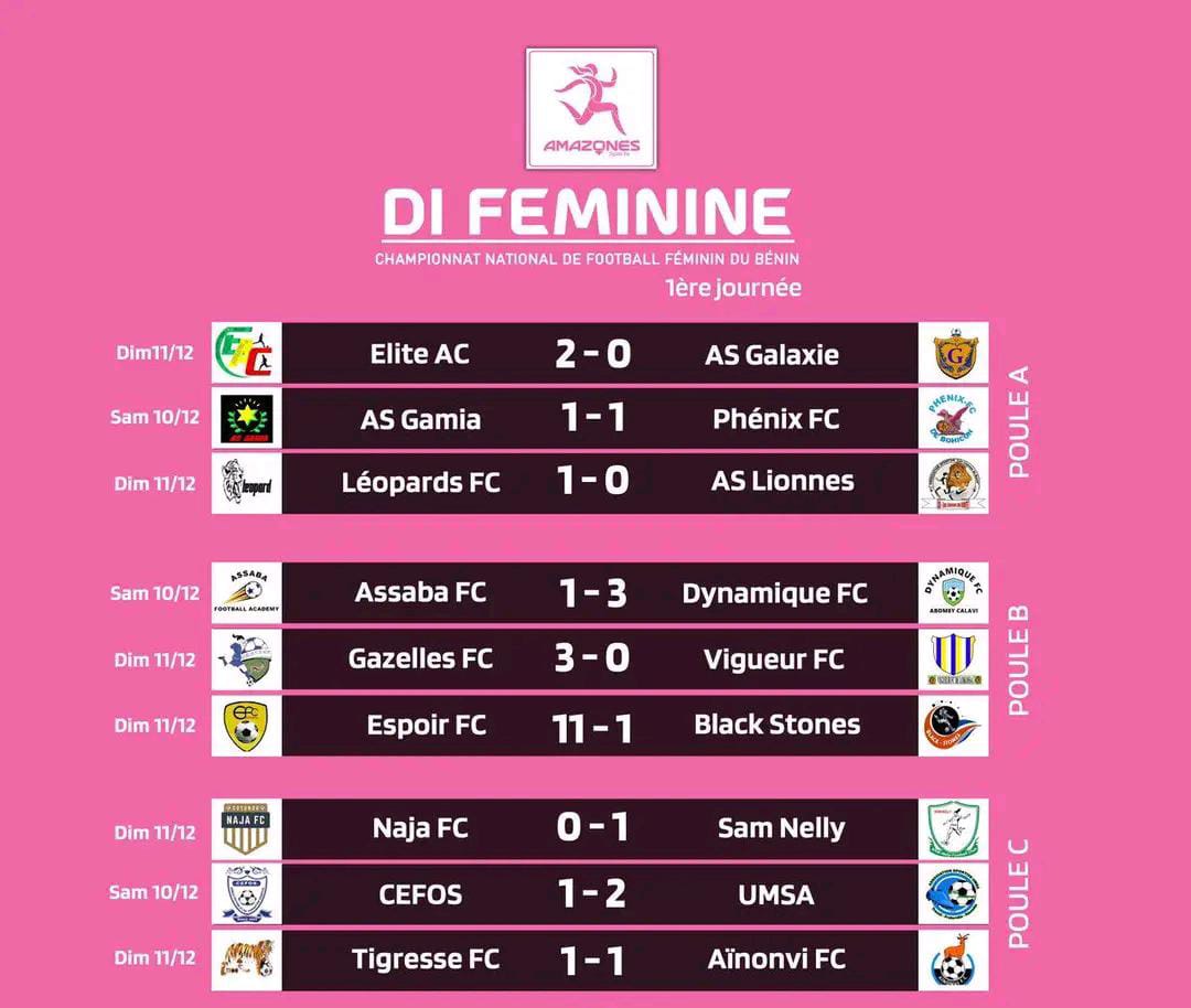 Le championnat national de football féminin a repris au Bénin depuis le 3 Décembre 2022. La première journée du championnat a connu son épilogue ce jour.