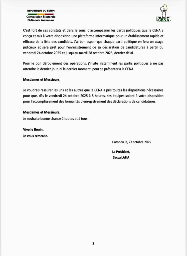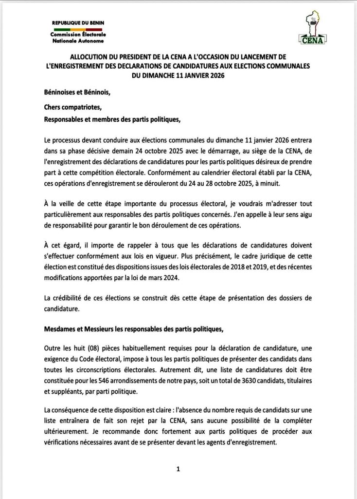 La Commission électorale nationale autonome (CENA) a annoncé, par la voix de son président Sacca Lafia, le démarrage officiel de l’enregistrement des déclarations de candidatures, pour les communales, à partir de ce vendredi 24 octobre 2025, au siège de l’institution à Cotonou. Les opérations se poursuivront jusqu’au mardi 28 octobre 2025 à minuit.