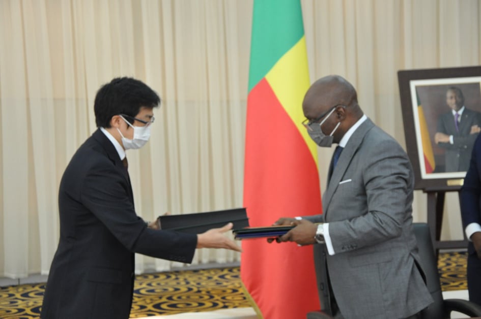 Le ministre des Affaires étrangères et de la Coopération M. Aurelien AGBENONCI a procédé, le mardi 26 janvier 2021, à la signature de quatre documents avec l’Ambassadeur du Japon près le Bénin, M. Tsugawa TAKAHISA et le Représentant régional de la JICA, M. Kojiro FUJINO en présence du ministre des Infrastructures et des Transports Hervé HEHOMEY a propos de deux Échanges de Notes et deux Accords de don, relatifs au projet de construction de l’échangeur de Vêdoko dans la ville de Cotonou et au projet de renforcement des systèmes d’alimentation en eau potable dans les départements du Couffo et du Plateau.