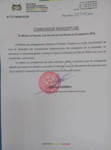La session de remplacement de l’évaluation des enseignants ACE 2008 est prévue pour le samedi 7 septembre 2019 au centre unique du lycée coulibaly de Cotonou.