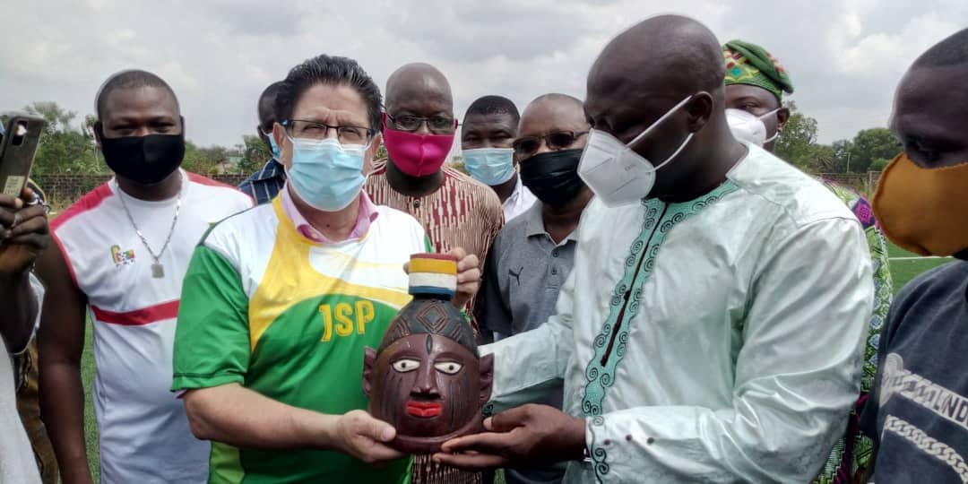 Pour immortaliser le passage de l’Ambassadeur à Pobè, le Maire lui a offert un maillot à l’effigie de la JSP et un masque Guélédé. Et c’était un moment d’émotion pour l’hôte de la commune de Pobè.