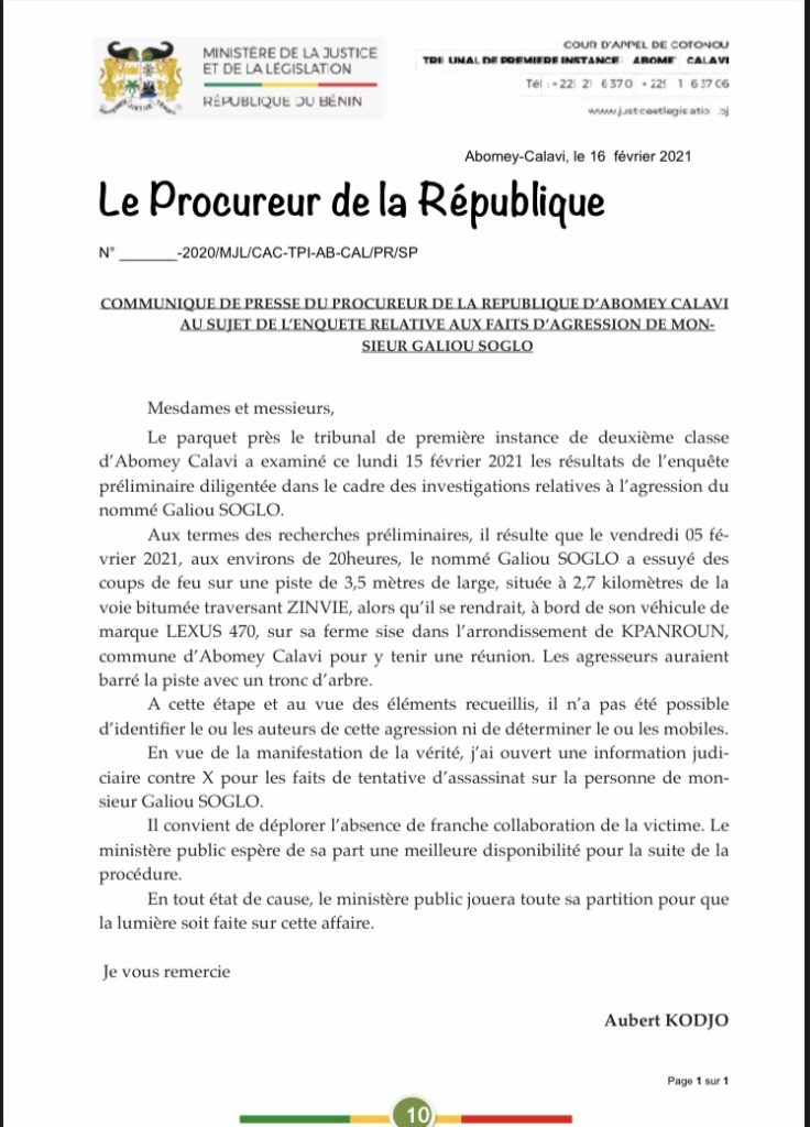 Toutefois, a-t-il indiqué, une information judiciaire est ouverte contre X pour les faits de tentative d’assassinat sur la personne de Monsieur Galiou Soglo en vue de la manifestation de la vérité. Outre cela, a précisé le communiqué, l’absence de la franche collaboration de la victime qui a été déplorée. Cependant le parquet de Calavi espère de sa part une meilleure disponibilité pour la suite de la procédure. Au total, le ministère public entend jouer sa partition pour que la lumière soit faite sur ce dossier.