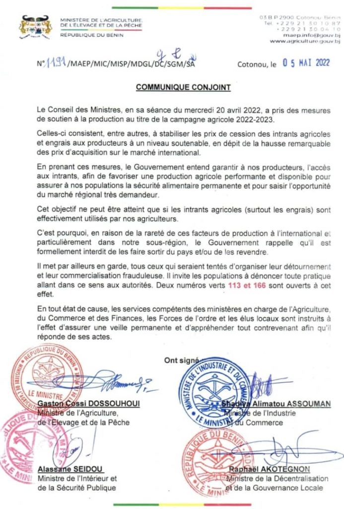 Par Communiqué conjoint signé des Ministres de l’agriculture, du commerce, de la décentralisation et de la sécurité, le gouvernement a réitéré l’interdiction de sortie frauduleuse du territoire national et/ou de la renvente des intrants agricoles. Auxquels cas, les contrevenants s’exposent à des sanctions sévères.