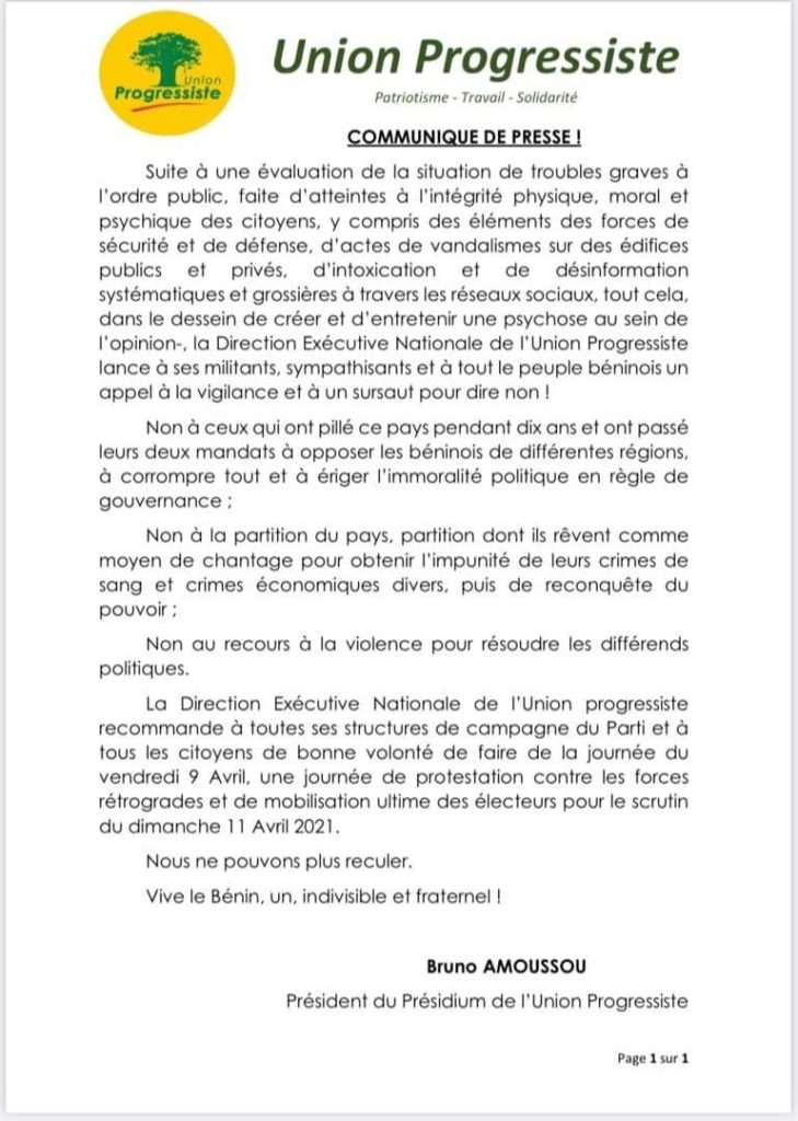 Ledit communiqué de presse signé du President de l’Union Progressiste, Bruno Amoussou, dénonce les cas de « trouble graves à l’ordre public, faite d’atteintes à l’intégrité physique, morale et psychique des citoyens, y compris des éléments des forces de sécurité et de défense ; d’actes de vandalisme sur des édifices publics et privés ; d’intoxication et de désinformation systématiques et grossières à travers les réseaux sociaux, tout cela, dans le dessein de créer et d’entretenir une psychose au sein des paisibles populations et de l’opinion publique ».