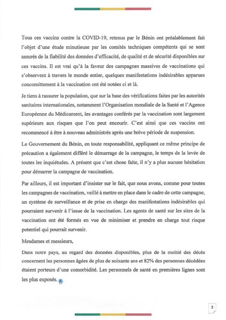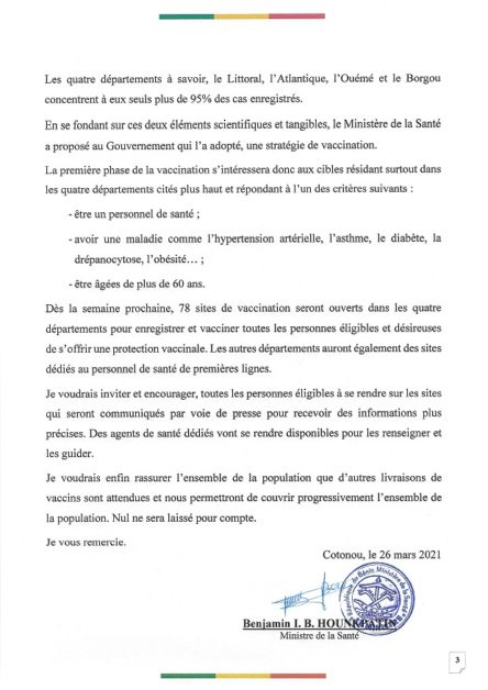 Selon le ministre, à la date du 22 mars 2021, le Bénin a enregistré 9 nouveaux décès dû à la Covid-19, de sorte que le tableau sanitaire indique 7100 cas au total et 90 décès; d’où la nécessité d’aller à la vaccination.