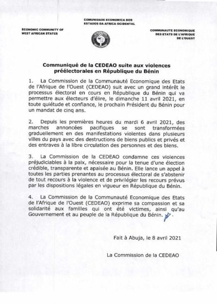 Suite aux violences et actes de vandalismes qui ont lieu dans certaines localités du Bénin, depuis le 6 avril dernier, la Communauté économique des Etats de l’Afrique de l’Ouest (CEDEAO) condamne à travers un communiqué rendu public.