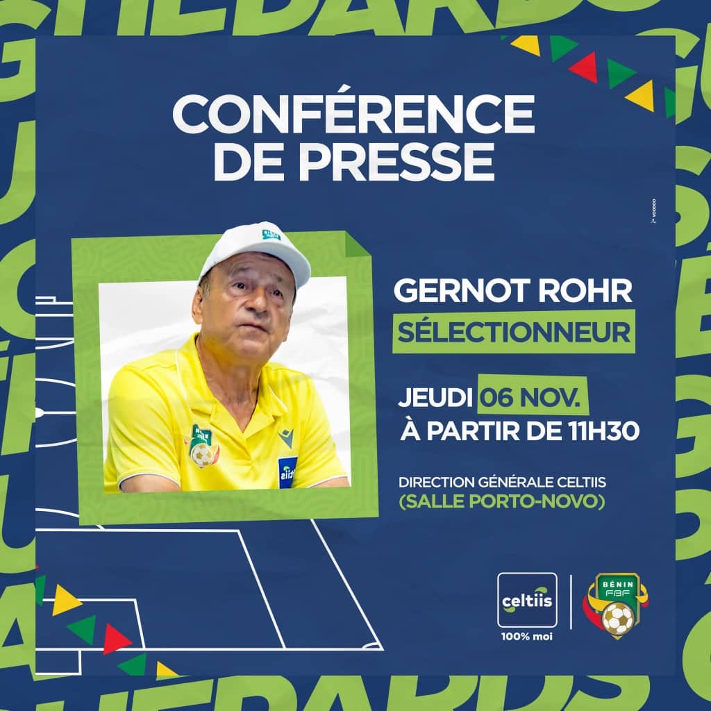 Le sélectionneur national des Guépards du Bénin Gernot Rohr sera en conférence de presse ce jour, pour dévoiler la liste des joueurs convoqués pour les journées FIFA de novembre.