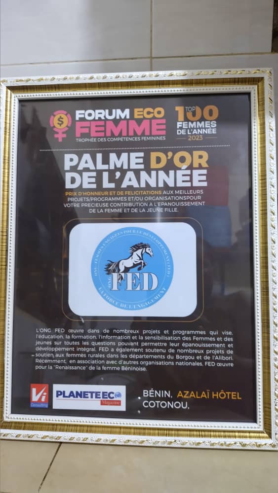 Au nombre de celles-ci, l’organisation non gouvernementale FED,« Femmes Engagées pour le Développement ». Sa présidente Raïmath Djibril Moriba, a donc, eu l’insigne honneur d’obtenir la Palme d’or de l’année, symbole de consécration et de couronnement des activités et des actions menées par l’organisation au Bénin, depuis sa création.