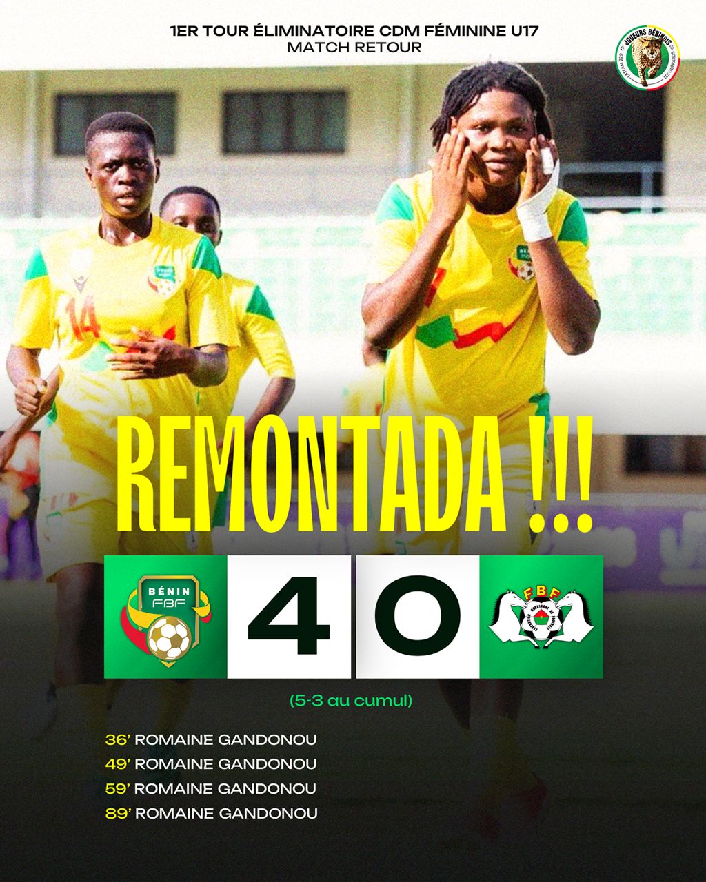 Au cœur de cette performance historique, un nom : Romaine Gandonou. Déjà buteuse lors du match aller, l’attaquante béninoise a livré une prestation exceptionnelle en inscrivant les quatre buts de son équipe. Un quadruplé décisif qui scelle à lui seul la qualification du Bénin pour le tour suivant.