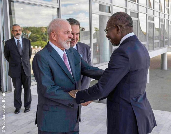 À l’invitation du Président de la République fédérative du Brésil, Son Excellence Monsieur Luiz Inácio Lula DA SILVA, le Président de la République du Bénin, Son Excellence Monsieur Patrice TALON, a effectué une visite officielle à Brasilia, le 23 mai 2024. Cette visite a marqué une étape décisive pour dynamiser et donner un nouvel élan aux relations bilatérales entre les deux nations, dans l’intérêt mutuel de leurs peuples. Le Bénin et le Brésil, liés par l’histoire et attachés aux valeurs démocratiques et aux droits de l’Homme, aspirent également à promouvoir leur vision commune pour un monde plus juste, un système multilatéral plus représentatif et une diversité culturelle enrichissante, où dominent les règles et principes du droit international ainsi que la défense de la paix et de la sécurité.