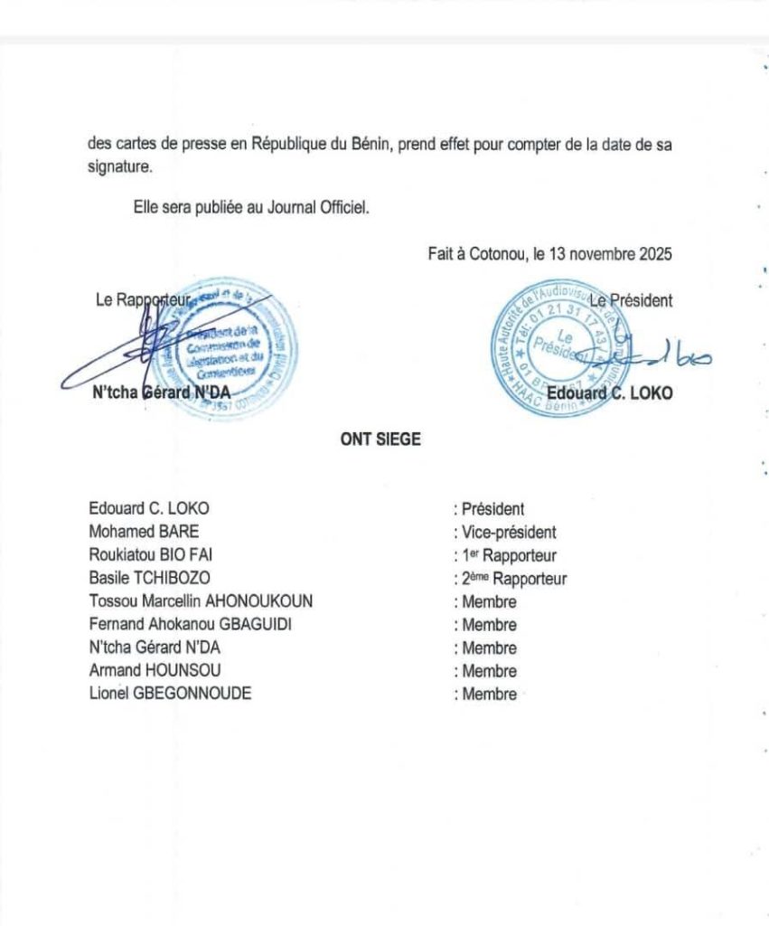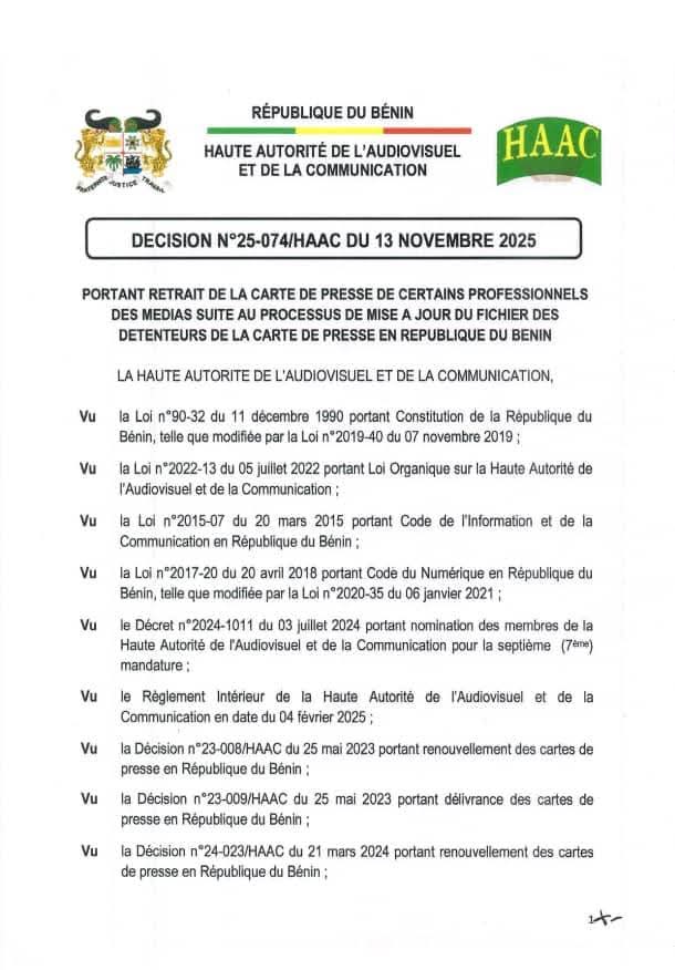 Cette mesure s’inscrit dans la dynamique de la HAAC de garantir un environnement médiatique plus rigoureux, conforme aux exigences déontologiques et professionnelles du métier de journaliste au Bénin.