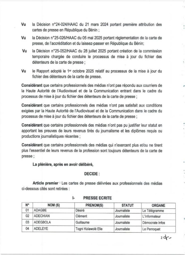 La 7ᵉ mandature de la Haute Autorité de l’Audiovisuel et de la Communication (HAAC) du Bénin renforce son engagement pour une presse professionnelle et crédible. Dans le cadre du processus de mise à jour du fichier national des titulaires de la carte de presse, l’institution a relevé plusieurs irrégularités après examen minutieux des rapports présentés en séance plénière.
