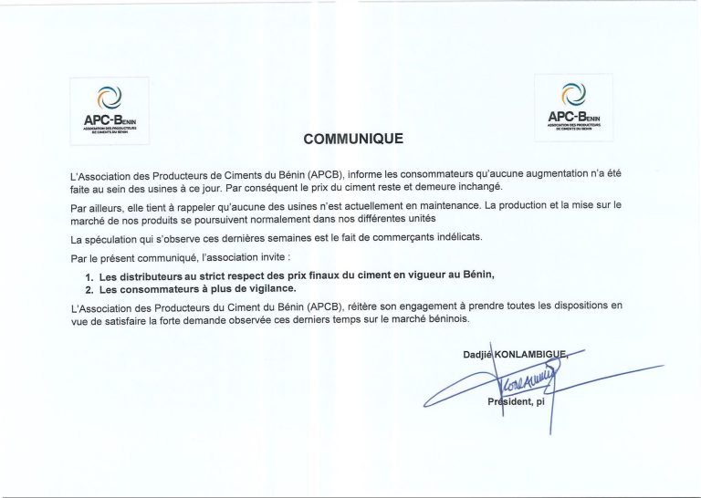 Dans un communiqué, l’Association des producteurs de ciment du Bénin (APCB) tient à clarifier la situation et indique que le prix du ciment à la sortie des usines n’a connu aucune augmentation.