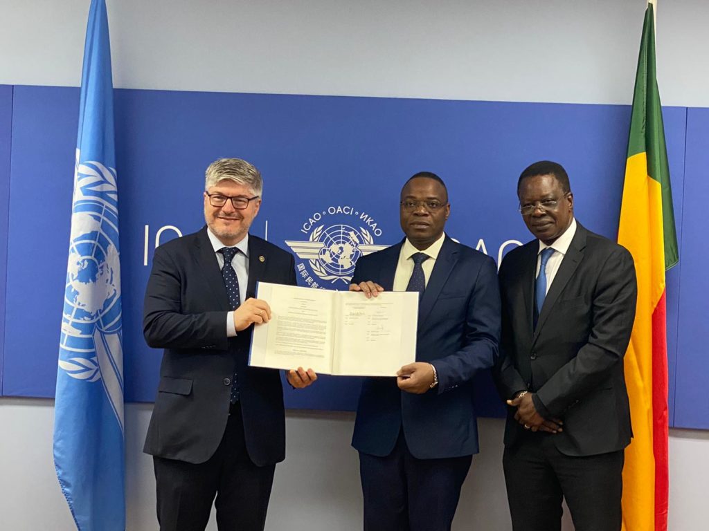 L’accord a été officialisé au siège de l’OACI, en marge de la tenue de la 41ième assemblée triennale, lors d’une cérémonie de signature en présence du Secrétaire général de l’organisation, Son Excellence Juan Antonio Salazar et du Chargé de Mission du Chef de l’État, Son Excellence le Capitaine Coffi Marcel OKAMBAWA Chargé de mission du Chef de l’État. Les membres de la délégation béninoise à la 41ième Assemblée triennale de l’OACI dont le Directeur général de l’Agence Nationale de l’Aviation Civile (ANAC), monsieur Karl Legba et les Consuls de Montréal et de Toronto, respectivement, monsieur Isidore Takpa et monsieur Yves Legault ont aussi assisté à la cérémonie de signature. Le Consul Legault a agi comme Conseiller auprès de l’Ambassade du Bénin à Washington et de négociateur principal dans ce dossier.